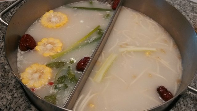 鸳鸯锅上来的都是清汤,后加的辣椒料,不过可以跟服务员说自己加,可以控制一下辣度。