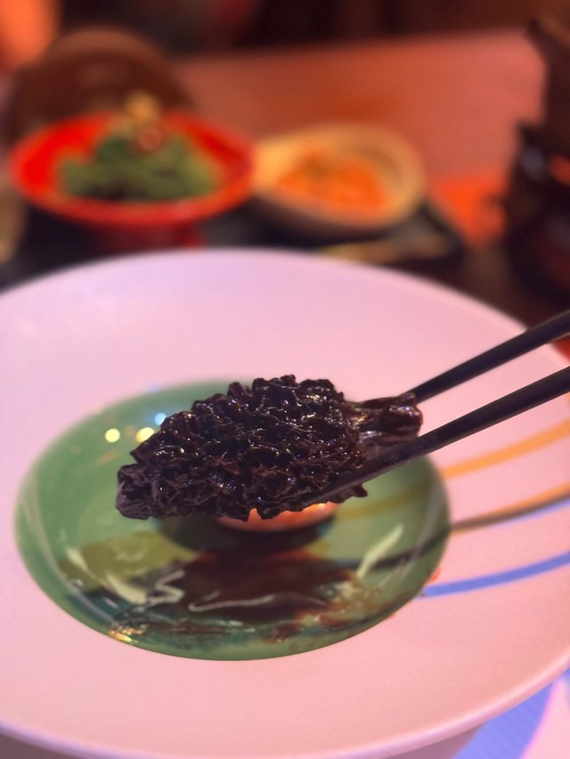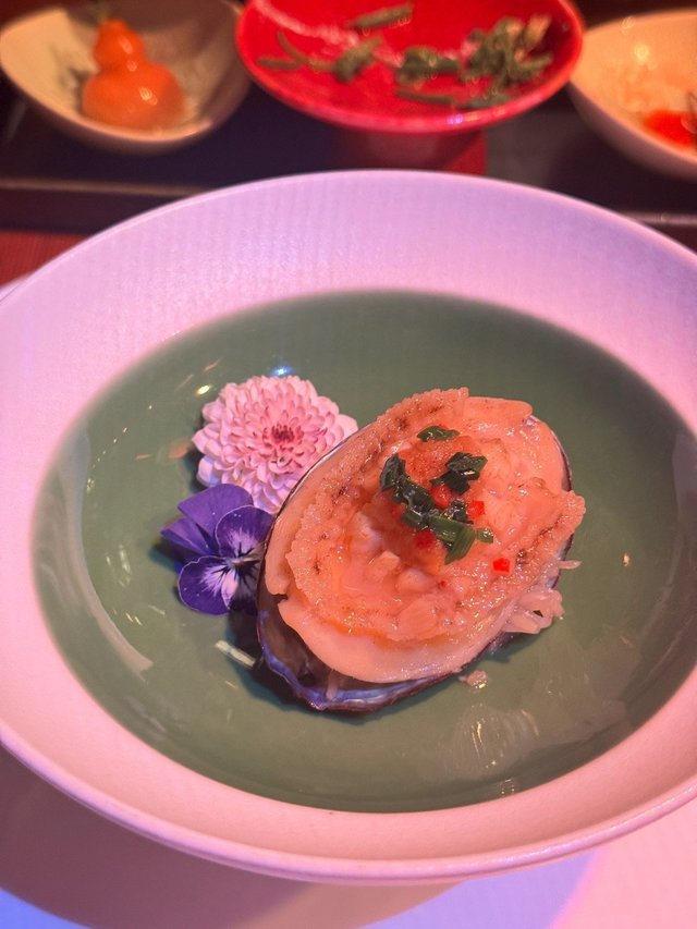 碧玉凝波映鮮鮑:鮑魚手掌咁大隻,但咬起嚟很費勁,蒸得過火少少,但配搭着蒜蓉小米椒,整體味道香而不膩,好聰明地用芋絲放喺鮑魚底可以吸收醬汁鮮味。