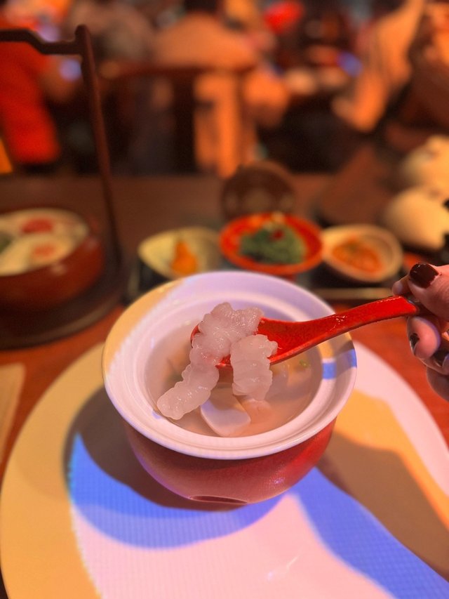 仙橋瑤柱燉花膠:用蠟燭助熱,花膠雖然唔係用上好靚嘅花膠,但都算爽口有骨膠原、瑤柱燉至入味,仲有豬肉粒可以食到,湯頭比較清淡,但飲落好滋潤。
