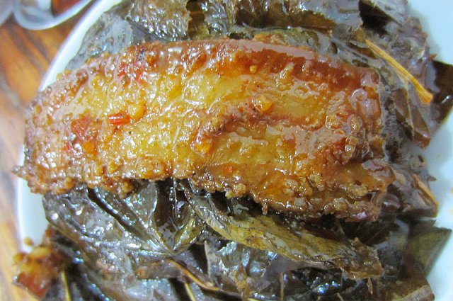 【荷叶粉蒸肉】20,这个已经算其中最特色的吧,荷叶粉蒸,肉很大一块,一片荷叶包裹着一片肉,让荷叶的香充分融入到粉蒸肉里面,肉被蒸得软糯酥烂,其味道还是很不错的,但是他家选用的五花肉太肥,吃起来是相当的油腻。