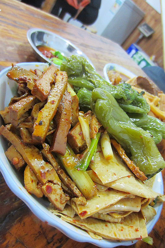 【小菜拼盘】8,拌菜,可以拼三样,都是整好摆在外面滴,我选择了豆干,豆腐皮,和虎皮青椒,每样都很多,分量足,这个天气吃着有些凉了,觉得虎皮青椒不咋样,其他的麻辣还是符合我的口味滴。