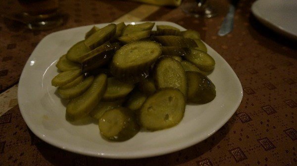腌黄瓜15元。酸酸的口感很开胃。喏尼娅说在俄罗斯人们冬天常吃这个。因为俄罗斯冬天极度寒冷新鲜蔬菜少。 腌白菜15元。喏尼娅说白菜在腌制过程中因为放了特殊的佐料所以就变成了红色。辣妈品尝了一下觉得有股浓浓的蒜香非常好吃清脆就着黑面包吃很香还能减肥。 国王沙拉28元喏尼娅说这是用俄罗斯特有的红菜做的沙拉因为新奇和美味辣妈就着黑面包吃了好多。有奶酪香味的沙拉真是好吃啊!