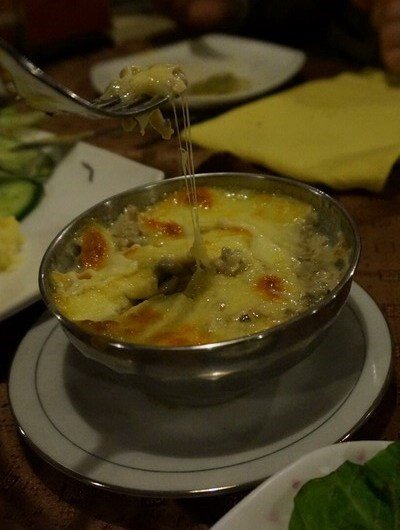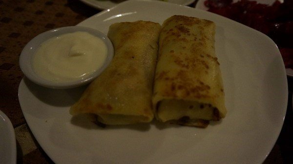 肉馅煎饼32元:这个煎饼的特色就是外面的饼皮是软软的沾着奶酪吃很醇厚肉香的感觉!红菜汤28元 这个汤也是用俄罗斯特有的红菜配上牛肉和淡淡的奶酪做的。酸酸的泛着牛肉的香味蛮好喝的。红菜真的很红哦,服务员端盘子的是有因为摇晃,碗的周边也泛着红汤了呢!