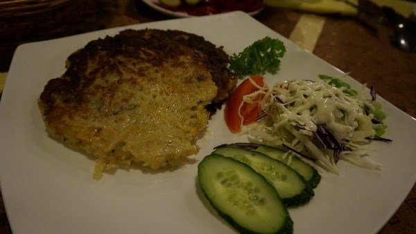 蔬菜牛肉饼,价格不记得了。这个煎饼很有特色,因为外面是裹着蔬菜的煎饼所以用刀切不太方便,有点吃撑了的辣妈品尝这道菜时明显感觉到了俄罗斯菜的油腻厚重。怪不得俄罗斯人模子都很大原来都是高热量吃出来的啊!
