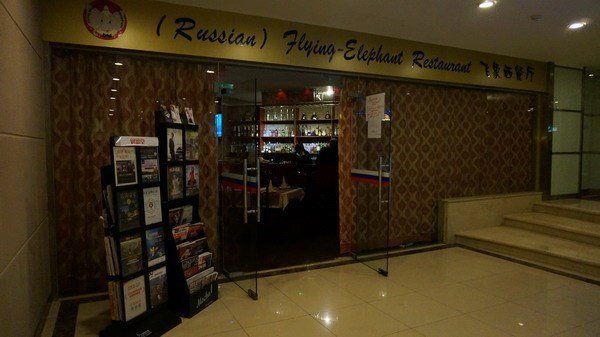飞象西餐厅:位于广东路525号金外滩宾馆3楼 。金外滩宾馆位于人民广场附近交通便利,在夜幕中华灯闪烁分外华丽! 飞象餐厅在金外滩宾馆的三楼,一下电梯就能够看到。门面看着不大但是里面占地面积还是蛮大的说。据辣妈的这位俄罗斯朋友“喏尼娅”说,上海一共有三家俄罗斯餐馆,这家是历史最悠久的。 餐厅大堂灯光昏暗一副酒吧的氛围,墙壁是古朴的砖墙设计桌椅也是木质的非常简单。特色就是餐巾,一个一个的尖尖角非常惹眼别致! 门口的一边是酒吧台,里面放的都是各种俄罗斯酒。辣妈想到俄国人一直喜欢喝酒怪不得,这里的酒架被放得满满的呢! 酒吧台上代表这餐厅标记的大象摆设非常有特色,辣妈忍不住拍张照片留做纪念! 门口的另外一边是挂在墙上的各色照片,记录了中外朋友在这里聚会的欢乐场景! 酒吧里面有个舞台,听说这里平时九点是有演出的,但是临近春节演员们都回家过年了。所以这是辣妈的一个小小遗憾哦!要不然一边听着音乐一边就餐那是多么浪漫的一件事啊! 餐厅墙边有一排形色各异的铜人他们带着圣诞帽子倒是很有喜气的说。 餐厅墙上是各色小盆景布置在昏暗的灯光映衬下看着很温馨。 餐桌上的餐巾纸 牙签 调料和鲜花都摆放得非常别致! 以下就是辣妈同学的朋友来自俄罗斯的“喏尼娅”帅哥请客的俄罗斯大餐。喏尼娅是个中国通能说一口流利的京韵普通话。据他介绍:俄罗斯菜比较油腻实顿顿,要是每人一份这种西餐吃法估计每个人都会吃成水桶腰的俄罗斯老大妈。所以他点了口感相对清淡的俄罗斯特色菜并且沿用中国吃大席方式来请我们四人吃饭! Baltika一种俄罗斯啤酒25元。据喏尼娅说这种瓶酒一共有9种型号,数字越大酒精含量越高。我们喝的是7号,据奶爸说和国内的普通啤酒度数差不多。 格瓦斯:一种俄罗斯酒馆特色饮料。喏尼娅说因为店里放的香料不同所以比市面上卖的瓶装同款要好喝很多。辣妈今晚就是喝这种饮料味道确实不错好喜欢。可惜价格记不清了。