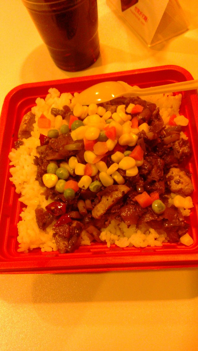 这家是快餐店,中式西式的都有,有很多的盖饭,不过不是普通的宫保鸡丁之类的,什么溜肉段饭、芽菜碎米鸡饭,卤肉饭之类的,饭一般20左右一份,有时候有特价,15块钱,还是比较划算的。芽菜碎米鸡饭挺不错的,里面有芽菜,胡萝卜丁,鸡肉丁等等,特别 下饭,挺不错的。西式的有汉堡,薯 条,鸡翅之类的,做的还不错,价格也不贵。