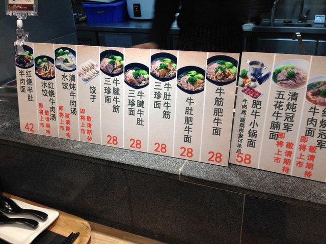 我刚入店的时候食客还不算多,待我取餐完落座后,用餐的客人慢慢就多了起来。点餐的方式是,首先在门口取托盘和餐具,再根据开放式厨房外边的明码标价菜单告诉服务员点的什么,之后便可亲眼看着服务员现做。一位负责捞面,一位负责加汤和牛肉蔬菜等。