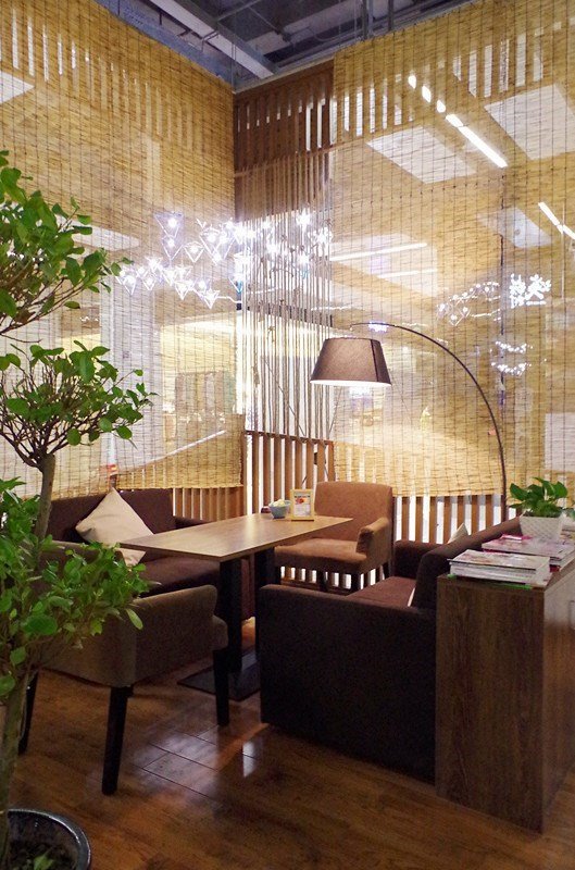 整个店面很大,算是半开放式,外围用粗麻绳和竹帘遮挡作为围挡,自然朴实却让人觉得舒适。 门口的店员妹妹招呼热情,服务细致。 店内有很多植物:可爱的多肉,翠绿的柚子苗还有各类水培植物。 配合明黄温暖的灯光营造出一种舒适的治愈系环境。 尤其爱里面的一个沙发坐,吊灯在右,植物在左,座位宽敞,沙发柔软。
