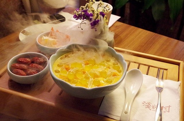 浅糖村的甜品主打的是意境噱头,所谓意境。其实是注重摆盘,各种大型的承装器皿,加入冰渣,放上干冰,看着诱人甜品置身在仙雾缭绕中,一个字 仙!