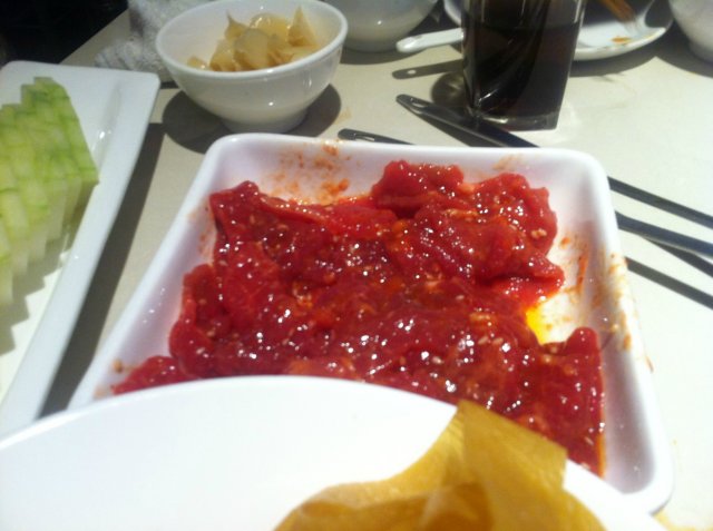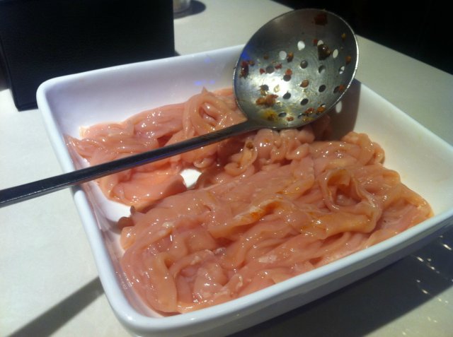 首先 2个手切的肉 自然是很嫩 是被腌制过的肉 上来的时候里面还可以看到很多花椒粒 辣子什么的 我觉得比小肥羊的手切肉要好吃