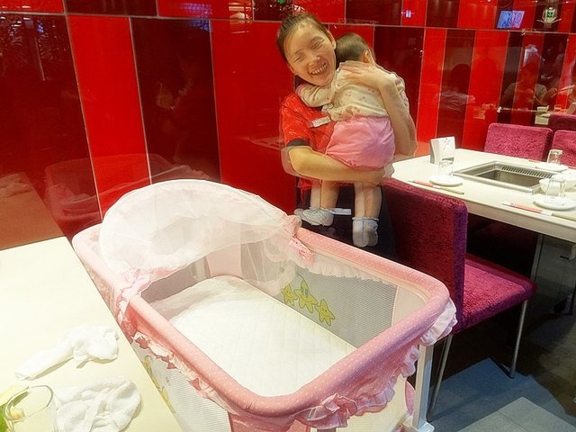 海底捞有宝宝床哦!很漂亮的宝宝床,而且我家桔宝睡着太舒服了。