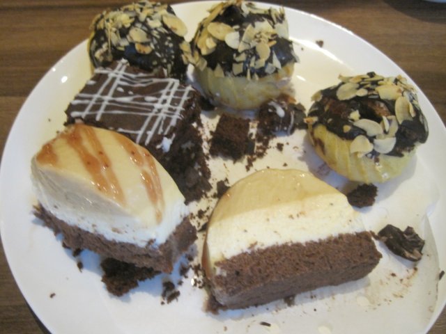焦糖布丁比某甜品店做的好.甜甜圈吃了好几个,不赖.还有全麦面包,可以抹了巧克力酱和花生酱等等去烤下,可惜吃的时候快到2点了师傅们都给撤下了. 通心粉主食感觉洋葱比较多,里面有蘑菇,.