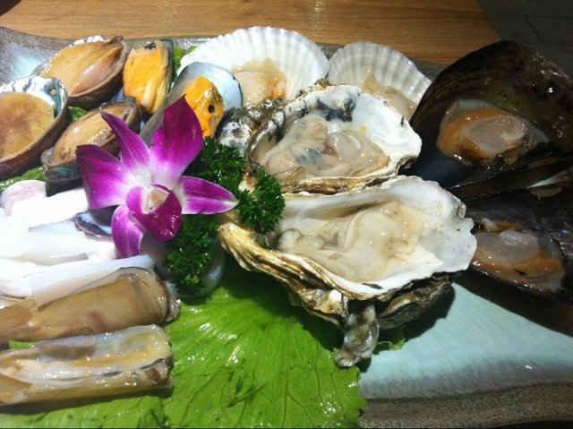 海鲜有:鲍鱼 、花蟹、虾、生蚝、带子、扇贝、青口、圣子、鱿鱼 、