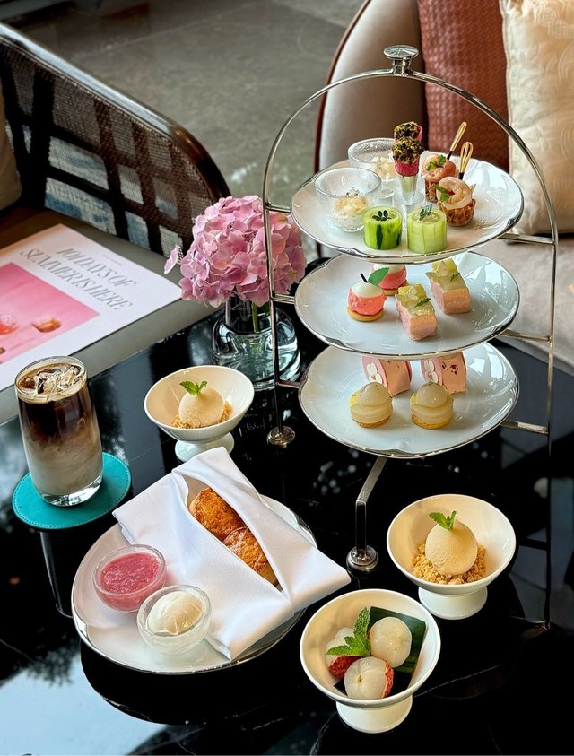 这次夏季主题下午茶🫖以岭南荔枝做主角✨,整套咸甜点心各半🫶,卖相精致且味道层次分明: