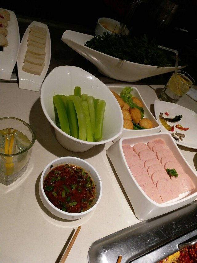我地叫左肥牛 羊肉 豬腩肉 萵笋 手打墨魚丸 午餐肉 魚腐同皇帝菜。 我哋全部都係點做半份呢一樣嘢係好貼心嘅因為有時候人少但係嘢食想叫多啲佢就可以叫半份咁就唔係浪費食物喇