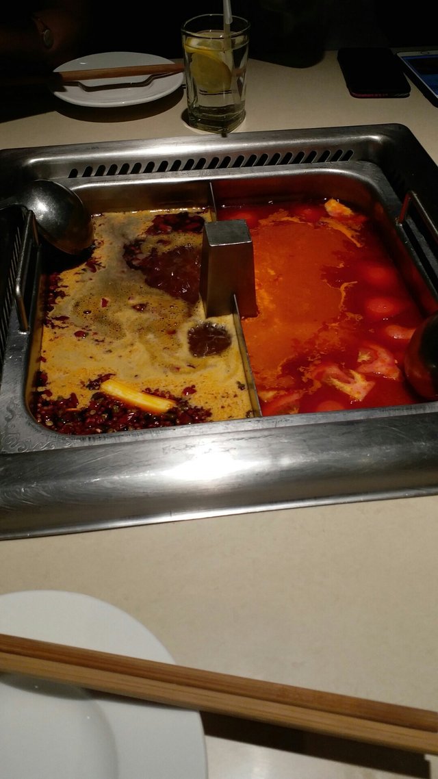 當然佢哋出名服務係一流嘅 其中一位朋友唔食辣嘅所以我哋叫左半個番茄湯另外一邊就係嗌咗牛油有麻辣湯。 之後我哋就去咗醬料吧嗰度攞醬