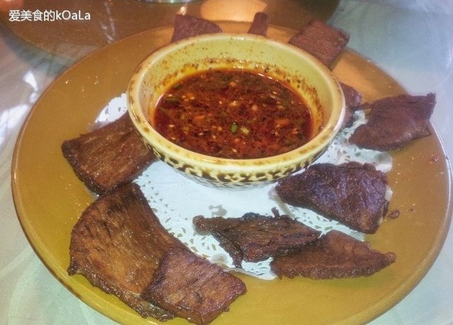 推荐啊!片状的牛肉,肉有嚼劲,全瘦肉,口感有些像是嫩的牛肉干!中间放着辣酱,个人觉得还好不是太辣,就是有些小后劲~味道是非常好的!