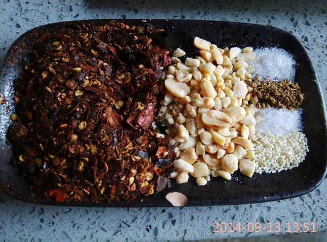 油碟是普通的油碟,干碟由辣椒面、花生米等东西组成,排得很漂亮,一看就是处女座的老板要求的。