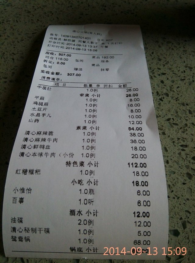 总共消费201元,价格稍微贵了一点,但是如果是吃环境,吃食材新鲜,这里还是绝对值得。