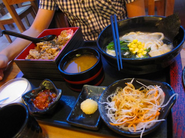 朋友点了个福膳,即以饭为主面为辅的一套餐:有一个麻薯,一份小西米露,一份肥牛饭和一碗乌冬、一碟泡菜和一碗味曾汤 真的很丰富 适合大胃口的人