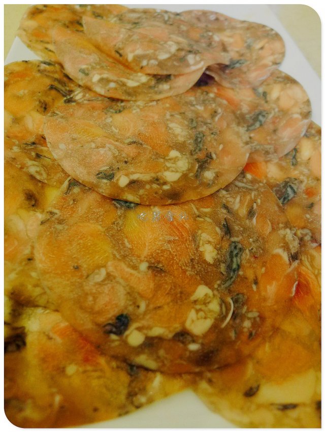 乌鸡风味鸡肉片,22元,原想是鸡肉片成片儿呢,不成想上来的是类似火腿的东西,原来是将乌鸡肉和皮加上别的东西做成的类似火腿的东西,然后切成一片片的,卖相是真够恶心的,口感更差劲,吃在嘴里跟吃泡沫似的,不如您踏踏实实的做点儿鸡肉卖,这种做法也太坑人了。
