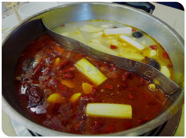 要了清汤麻辣鸳鸯锅,适合不同口味的人各取所需,麻辣锅涮肉,清汤锅涮蔬菜。无论是清汤还是麻辣锅,里面大大小小的调料是真不少,各种知道的不知道的全都在里面,清汤的还好,麻辣的里面调料更多,导致锅不知道是一种什么味道,纵使上面漂满了切碎的辣椒,不知道这辣椒为什么要切碎,不影响涮肉么?但这锅却并不辣,咸倒是挺咸的,所以吃辣锅不用蘸料倒还真是。锅上来烧了一会,还没往下涮东西呢,就出现了很多沫子,两边都有,特别多,但愿不是众所周知的原因。