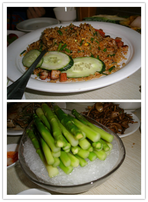 冰镇原条鲜露笋。看上去这个冷盘价格小贵!其实不然,一大盘都是整根的芦笋去皮制成的,绝对货真价实,冰凉的口感,爽啊!而且他家有个细节,冰块用保鲜膜包起来的,看上去很卫生。