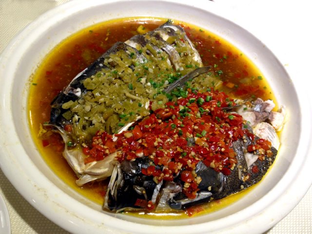 【双椒鱼头】店里的特色菜,剁椒鱼头59元,双椒鱼头68元,另外加鱼面6元。不打算怎么吃主食就没要面了。蒸鱼头比较费时,等了好久才上来。无论是剁椒还是泡椒都不辣啊....虽然辣椒铺的还挺满的....鱼肉不是很新鲜,只有靠着鱼腹方向那块比较嫩,其他吃起来口感发硬面面的。