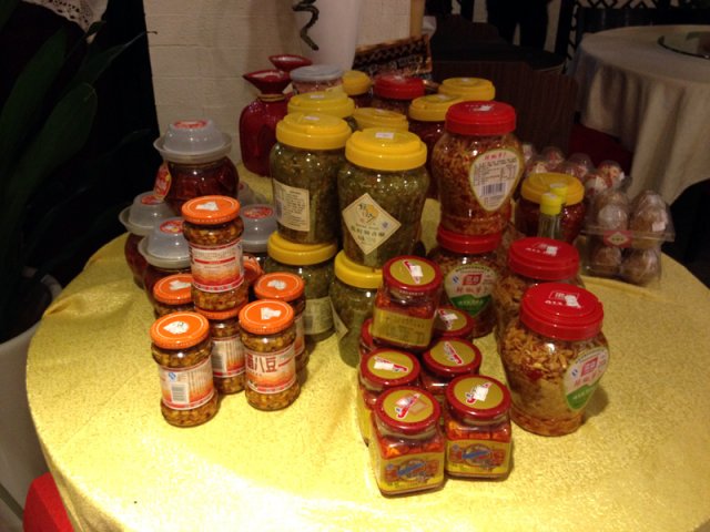 餐厅整个灯光都比较敞亮,靠窗是沙发卡座,吊灯也挺别致的,所以这一排的座位早早的就被占满了。大厅里有婚宴的仪式台,应该也承接婚宴吧。店里还卖一些湖南特产,酱菜和霉豆腐啥的。