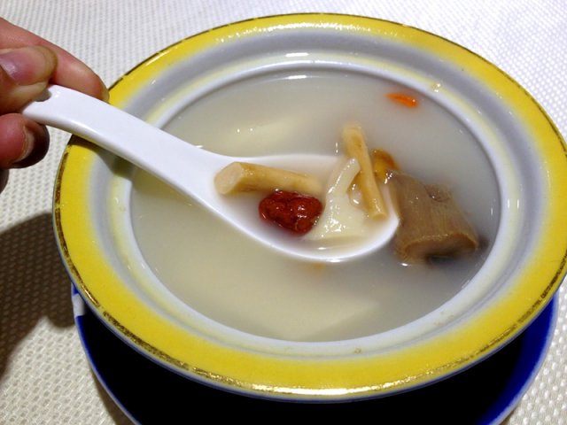 【山珍菌王汤】汤的种类有好几种,最后还是选了菌汤。分别有罐装48元,36元一例,15元一位。点给老公的,一位足矣,一共有六种菇,杏鲍菇、鸡腿菇、白玉菇、滑仔菇、香菇和茶树菇。汤汁奶白色,好像是鸡汁啥调的一样,味道很不喜欢,菇菇挺多的