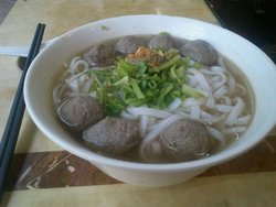 上星期五下班后肚子饿,跑去吃牛肉丸汤粉,到店服务员态度还不错。坐下后就上前问你要吃什么菜。点完餐后服务员递上来筷子沙茶酱,然后还倒了一杯茶。等了大概15分钟左右。热腾腾的牛肉丸汤粉端上来。里面河粉很细吃起来感觉很细腻。牛肉丸子应该是手工捶打制作而成的,很Q弹很有嚼劲,里面的汤是牛肉汤很香。里面撒了一些芹菜跟经过炸干的蒜碎使整道汤粉香味十足。值得推荐,很有潮汕味。
