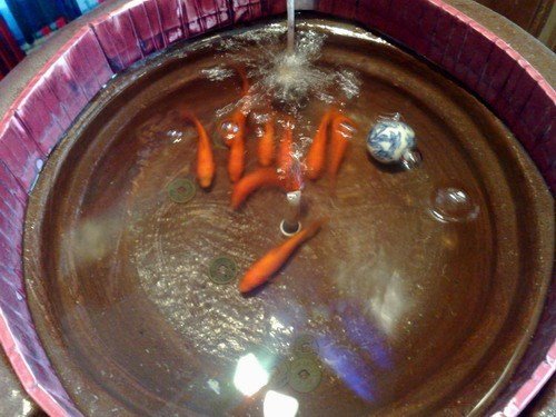 门口还有一个小小的鱼池,小金鱼在水中自由自在的嬉戏最最喜欢吧台上的彩色大公鸡啦