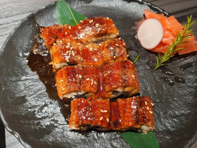 鰻魚烤得色澤金黃,表皮微微焦脆,泛著誘人的光澤。夾起一塊鰻魚放進嘴裡,一點腥味都沒有,只有滿滿的鮮甜。它是甜口的,對於喜歡甜食的我來說,簡直就是天堂