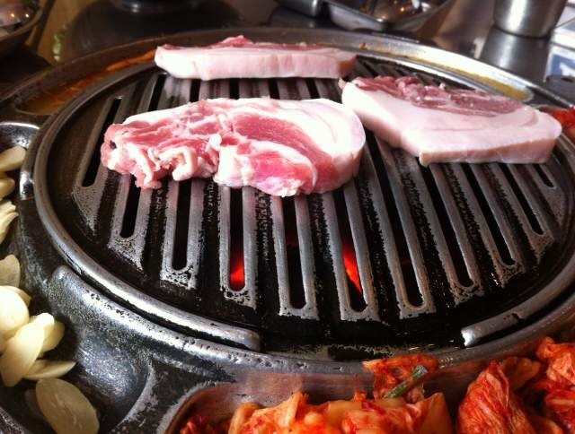 炭韩国烧烤这家店开在一二八纪念路上的宝山万达广场附近,这里交通非常方便。这家店是朋友介绍过来的,店面不大,但是店内环境整洁干净,不象某些烤肉店内非常油腻。它家的烤盘非常吸引人,中间可以烤肉,周围一圈可以用来涮些小菜,不过地方不是很大。比较喜欢它家的五花肉,肥瘦适中,它家的五花肉切片稍微有些厚,烤好后沾上调料后包裹着生菜吃起来特别爽。它家的烤肉皮也很特别,用肉皮做成卷后切片,烤后肉皮很糯也很Q,味道非常好吃。