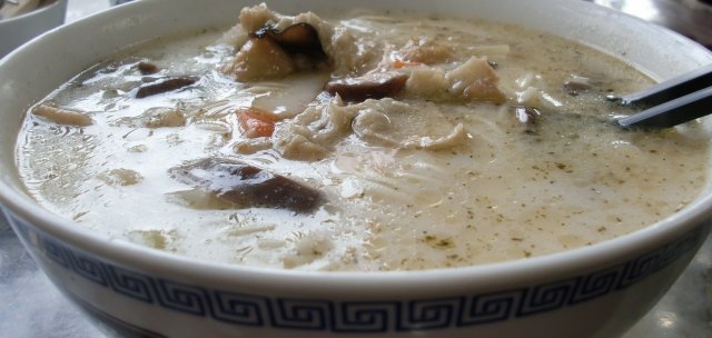 好大的一碗,面条真多。说是秘制,倒真是同一般的苏式煨面不同。面汤呈乳白色,不是酱色的,还漂着一些雪菜末。浇头显得实在太少,有豆腐泡、木耳、香菇、芹菜、胡罗卜,特别的是竟然还有银耳。觉得像中国版的日式拉面。面汤应该是骨头汤,很浓郁,喝一口,很鲜、很香。
