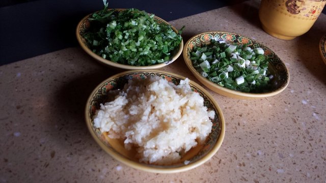 油碟分别配了一碟蒜泥,一碟香菜和一碟葱花,葱花明显是放久了,都快风干了,看着很不新鲜。