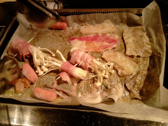 他家主打日式烤肉,还提供一些日式小食,如寿司、烤秋刀鱼、天妇罗、色拉、炸鸡块等等。都是自助的,58元一位。~~~~提醒各位,提早一个小时定位子的话可以每位优惠8元,也就是50一位。