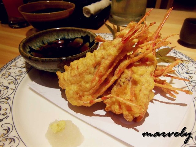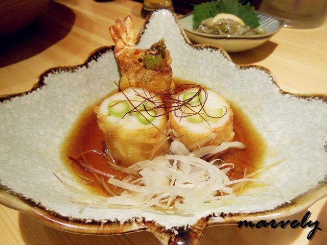 山药明虾奉书扬,相比炸虾天妇罗,我更爱吃这种,山药混着着虾肉泥,包裹着芦笋,炸过之后,吃到的是虾泥的Q弹口感,
