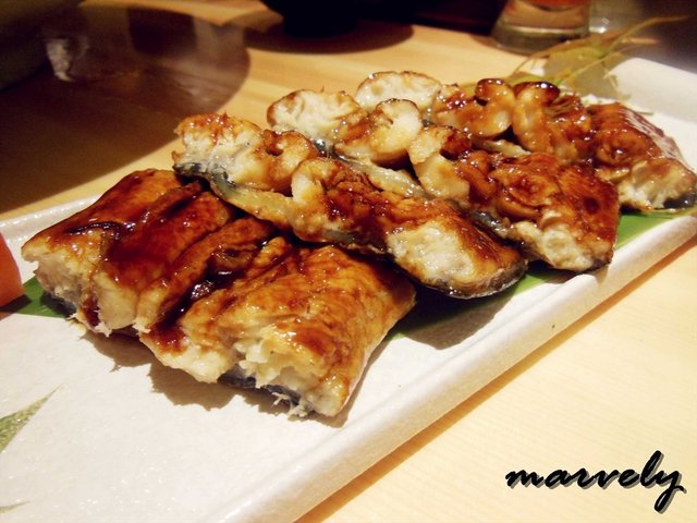 活鳗鱼蒲烧,酱汁让雪白的鳗鱼肉在灯光下显得熠熠生辉,厨师并没选择特别肥厚的部分,鱼肉在甜美的酱香味道的包裹里,柔软中带着稍许的韧度。