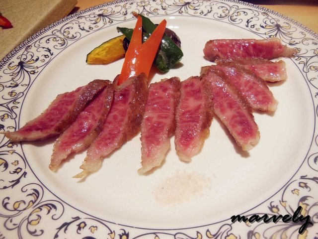 香煎澳洲和牛,切片的和牛肉上,有着美丽的纹路,外皮淡淡的焦度紧紧的锁住了水分,肥瘦相间的肉质吃起来柔而不腻。