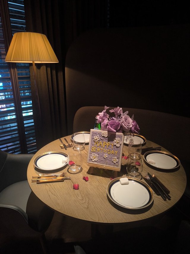一張張的大小圓檯,較近門口位置都是小情侶檯,檯面擺設以花為主及有一個小型畫架寫上“Happy birthday”,好有心思的佈置.