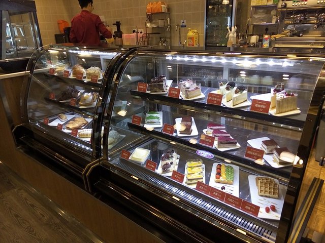 里面有各种饮料、甜品和西式糕点。因为地方不大,两个服务员正好忙的过来。门口边上还有一个奶茶口,供顾客买外带奶茶。