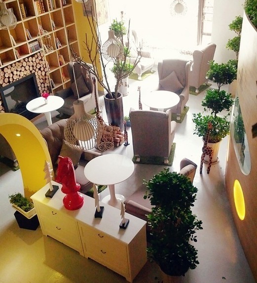 整个店里的装修时走萌系路线,比如大大的长颈鹿,比如说瓷制的象啊,比如说墙壁上色彩斑斓的插画啊。