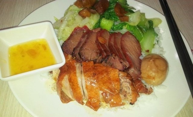 我和小菲都点了同样的东西,叉烧拼脆皮烧鸭,叉烧全精肉是我不喜欢的那种,但完全符合小菲的要求,出乎意料的是小菲这次都说不好吃了,肉瘦得过头,吃在嘴里完全没有口感...没有肉的香味更没有烧味的香味,淡淡的,一点也不入味,都不知道有没有涂过叉烧酱,反正就是不好吃~不过总分总算是被烧鸭拉回了一些,皮挺脆的,肉也是鸭腿部分有弹性,比较入味,不错!他们家的风格很像我们公司楼下的那家烧味店,同样都是烧味饭上面放卷心菜和几块萝卜干!