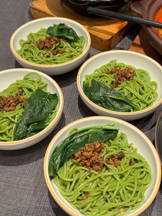 四碗擔擔麵,佢哋嘅麵條非常彈牙,而且係好特別嘅綠色麵條,再加點辣肉碎,好香口