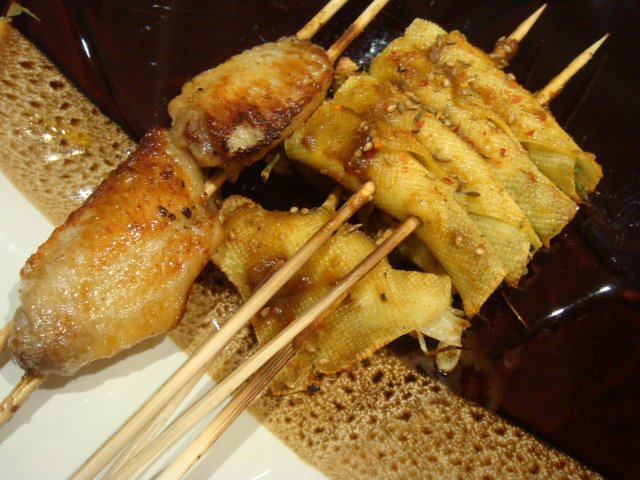 点了蜜汁鸡翅,这个是招牌,1串原味的,2串新奥尔良的,1串麻辣的还有骨肉相连,羊肉串。鸡翅6块一串,个头不算大,肉也不算多。蜜汁的确实挺好吃的,淡淡的甜味,深入在肉中。新奥尔良的就是那种烧烤的味道。麻辣的原味的一般。骨肉相连肉很面,没有那种烤鸡肉的鲜嫩的感觉,不好吃。羊肉串瘦肉比较多。