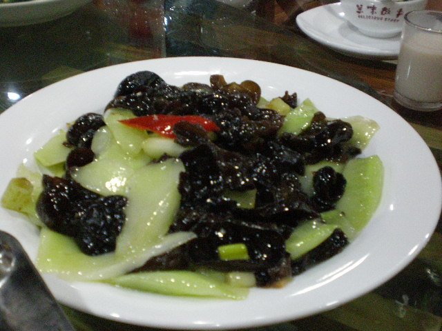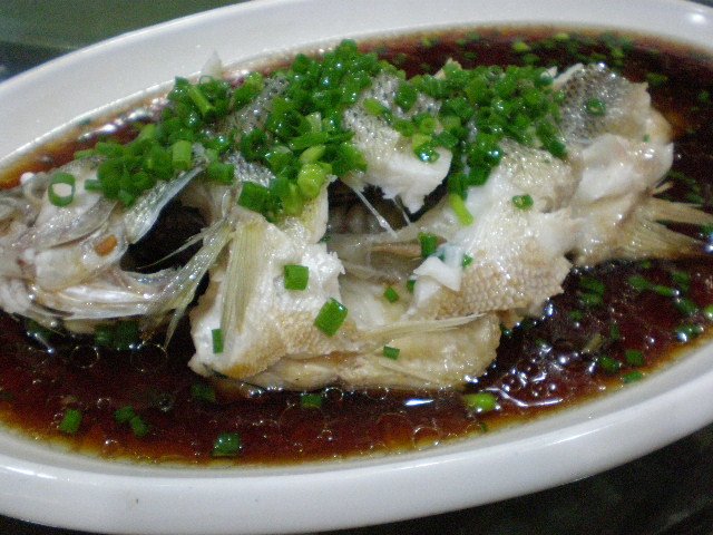清蒸鲈鱼。汤汁很丰富。鱼处理的很好,要是在家里弄,那股腥味不好去掉。这鱼特点是肉厚、刺少、肉质细嫩,厨师刀工还可以,把它分成一块一块的,刚上桌,不知被谁抢先挖走了一块,受欢迎啊。