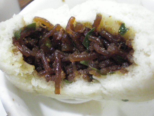不得不提的是他家的包子。粉丝鸡蛋馅的,另有少许肉,拿放大镜找的那种。包子一端出来,我便明白涨价了,价钱还是那个价,不过明显缩水了,目测小了一码。咬开来看看。