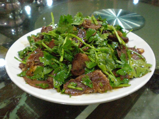 香菜牛肉。两者搭配的还不错。建议再把材料精选一下,肉还可切薄一点。