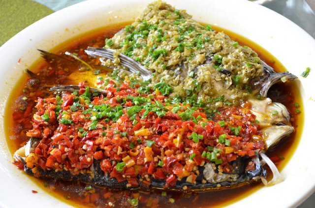 【双椒蒸鱼头】好大的盘子,好大的鱼头,不愧是压轴,半边红剁椒,半边青山椒,颜色对比鲜亮,看起来好有食欲。蒸鱼头肉质鲜美,但上面铺的海椒并没有起到多大的作用,两边的口味都不算辣。